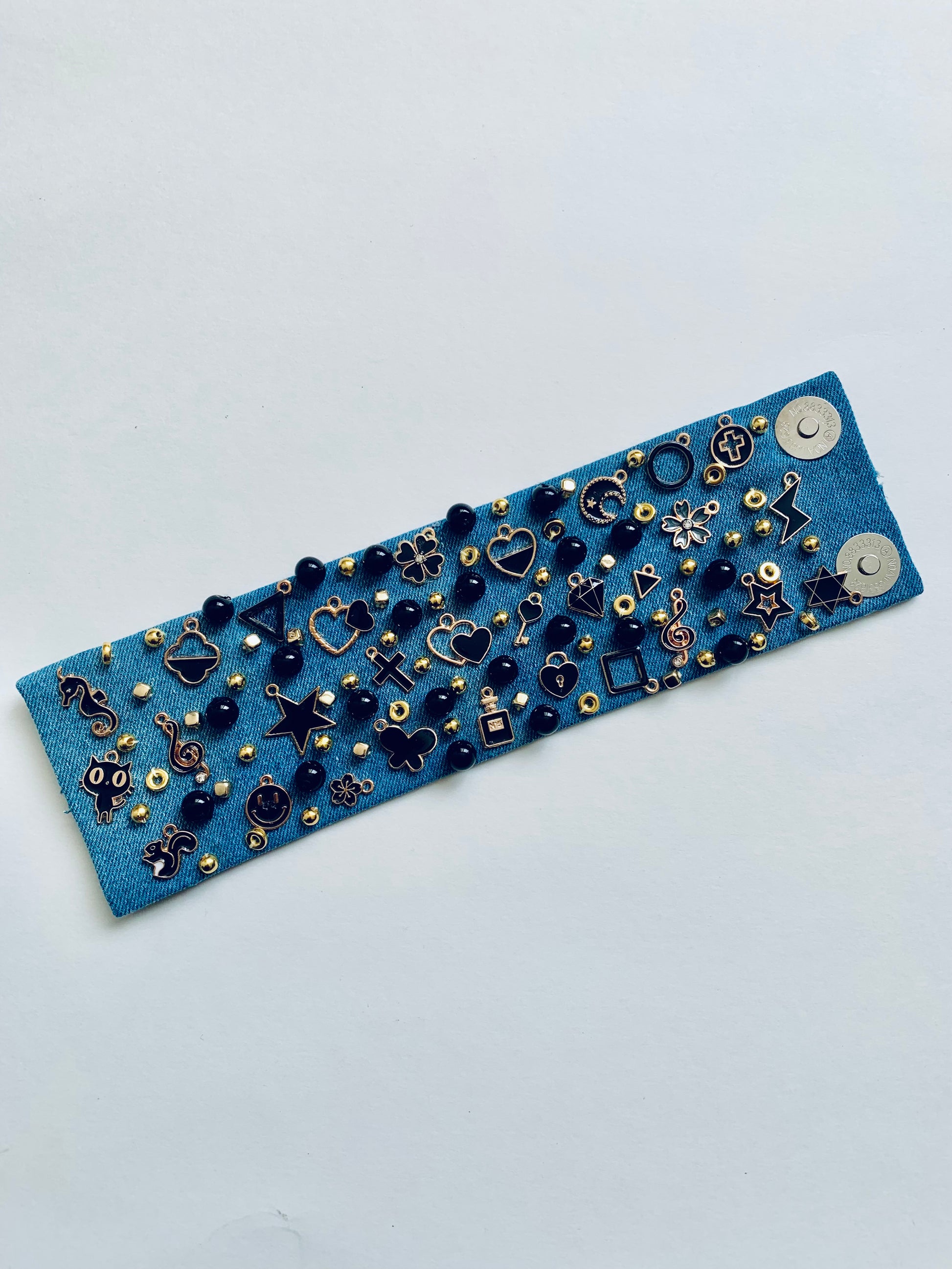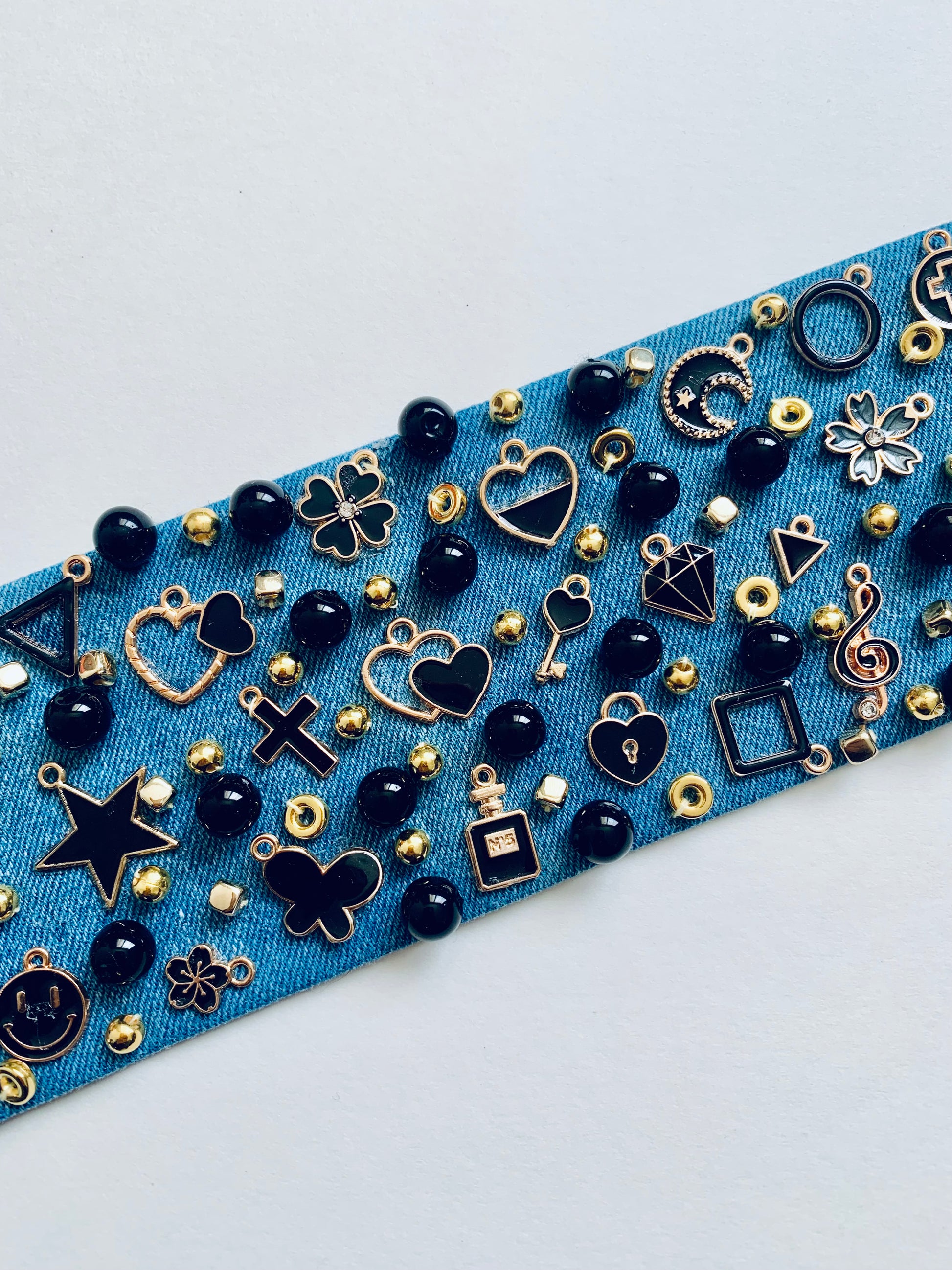 Black Heart Denim Bracelet with Charms & Beads– Boho Chic
