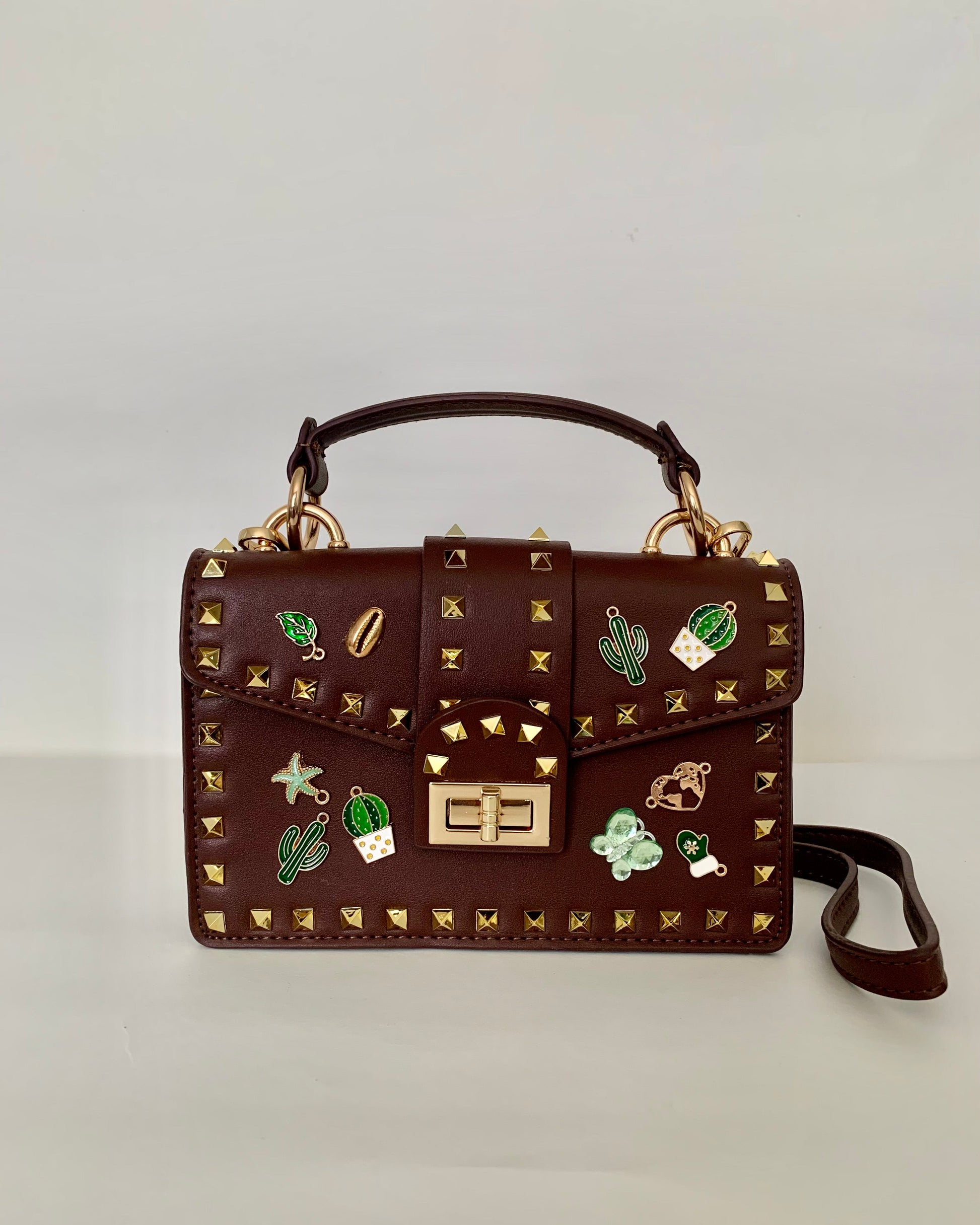 Brown Crossbody bag with Gold Studs and Decorative Pins