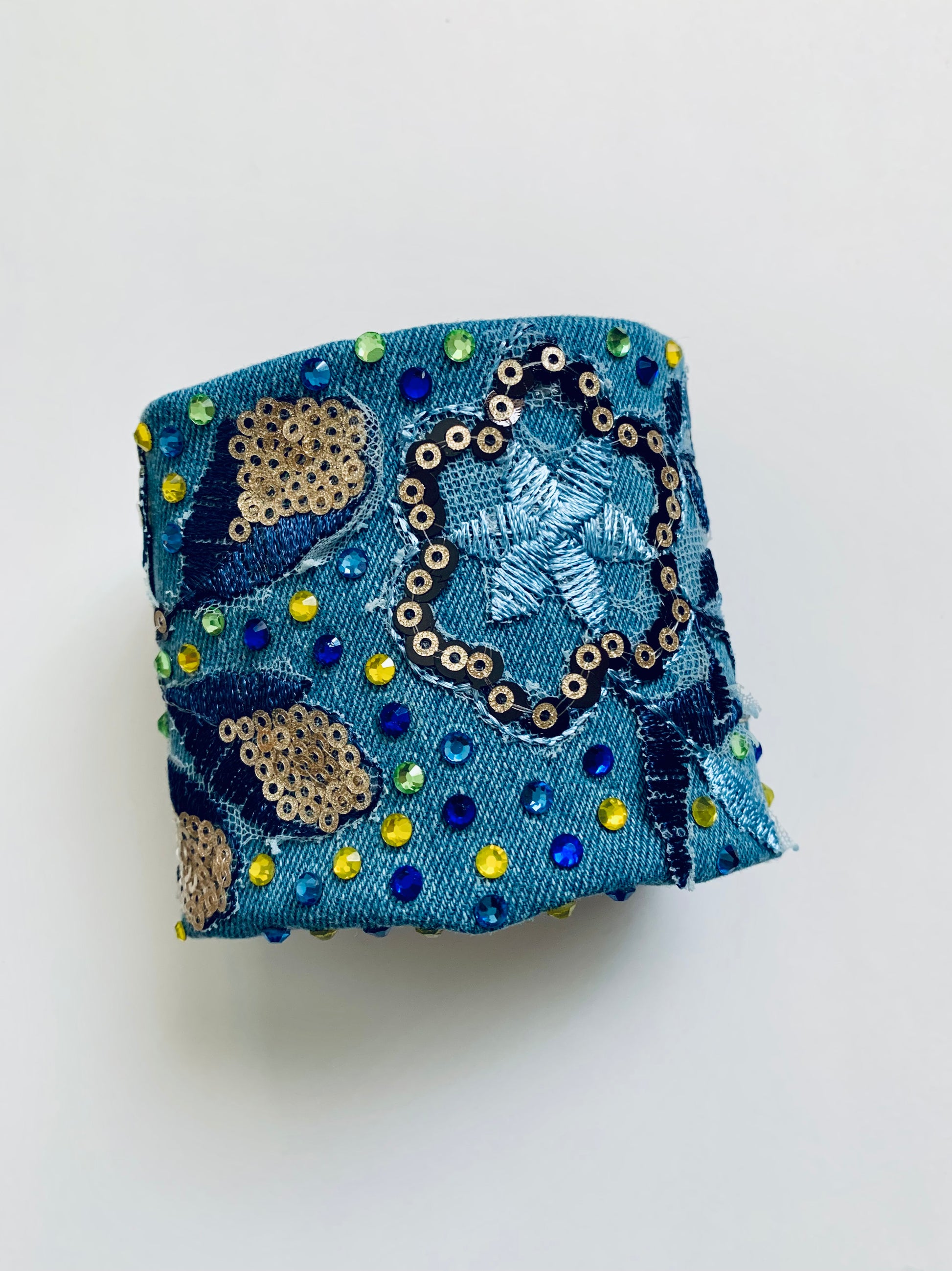 The Flora Denim Bracelet is a unique handmade accessory crafted with care in the USA. Created using premium denim and embellished with hand-placed rhinestones, embroidery, and decorative appliqués, this piece stands out with its vibrant colors and artistic design. Soft, flexible, and lightweight, Flora wraps comfortably around the wrist — perfect for everyday wear or as a statement piece to elevate any outfit. Each bracelet is handcrafted individually, ensuring that every piece is truly one-of-a-kind.