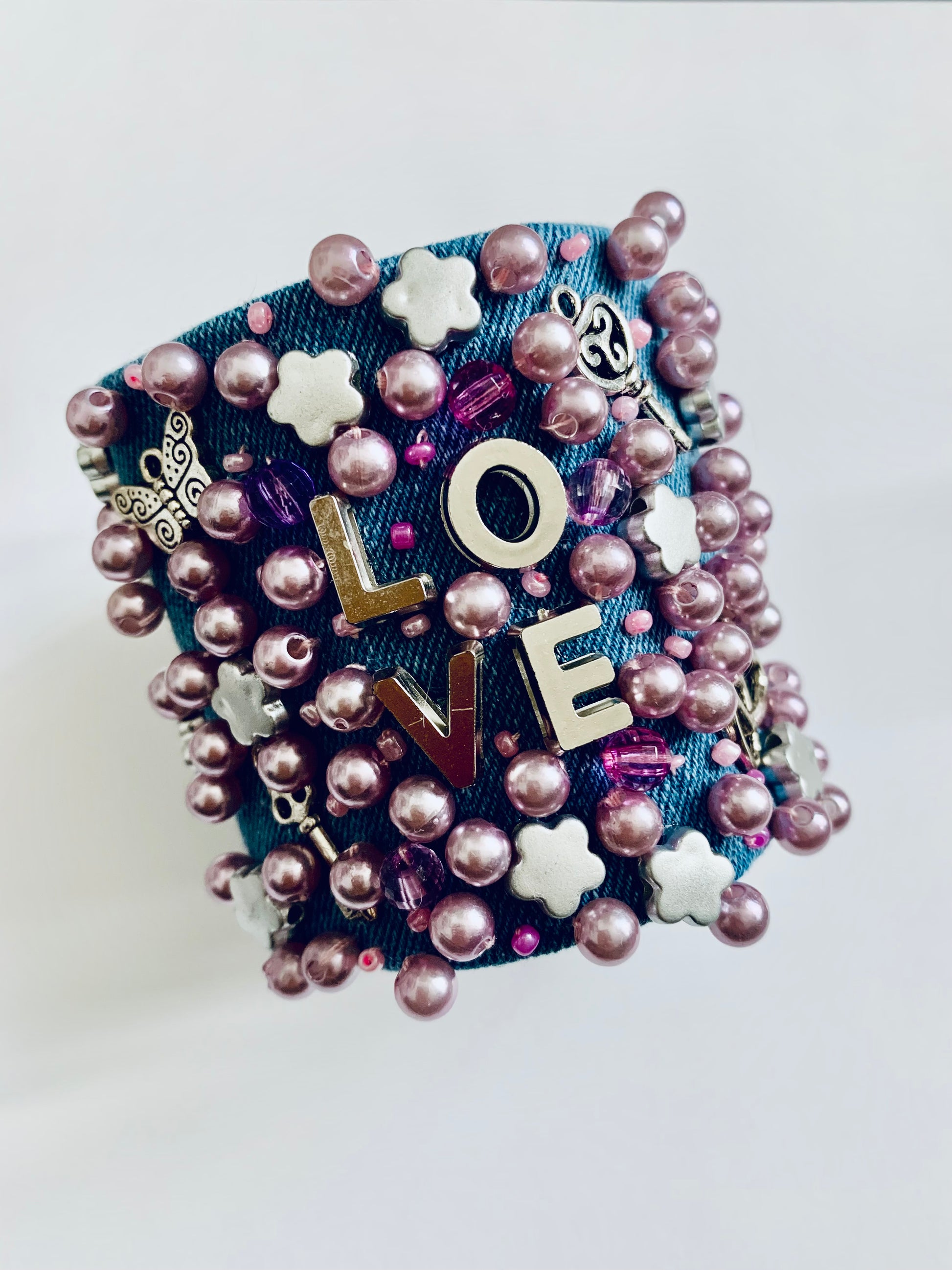 This eye-catching handmade denim bracelet is fully embellished with pink pearls, faceted beads, silver flower charms, and bold metal letters spelling “LOVE.” Each bracelet is crafted by hand, giving every piece a unique, artistic character and exceptional detail. The combination of denim, metallic accents, and layered pink beads creates a fun, fashion-forward statement accessory