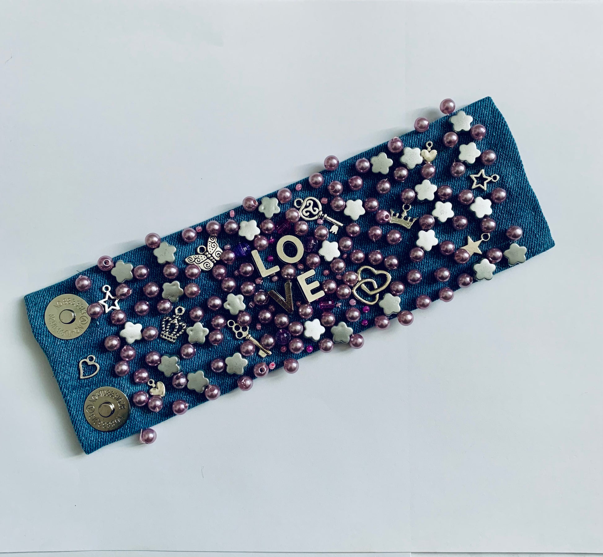 LOVE Denim Bracelet with Pearls & Charms Handmade Boho-Chic