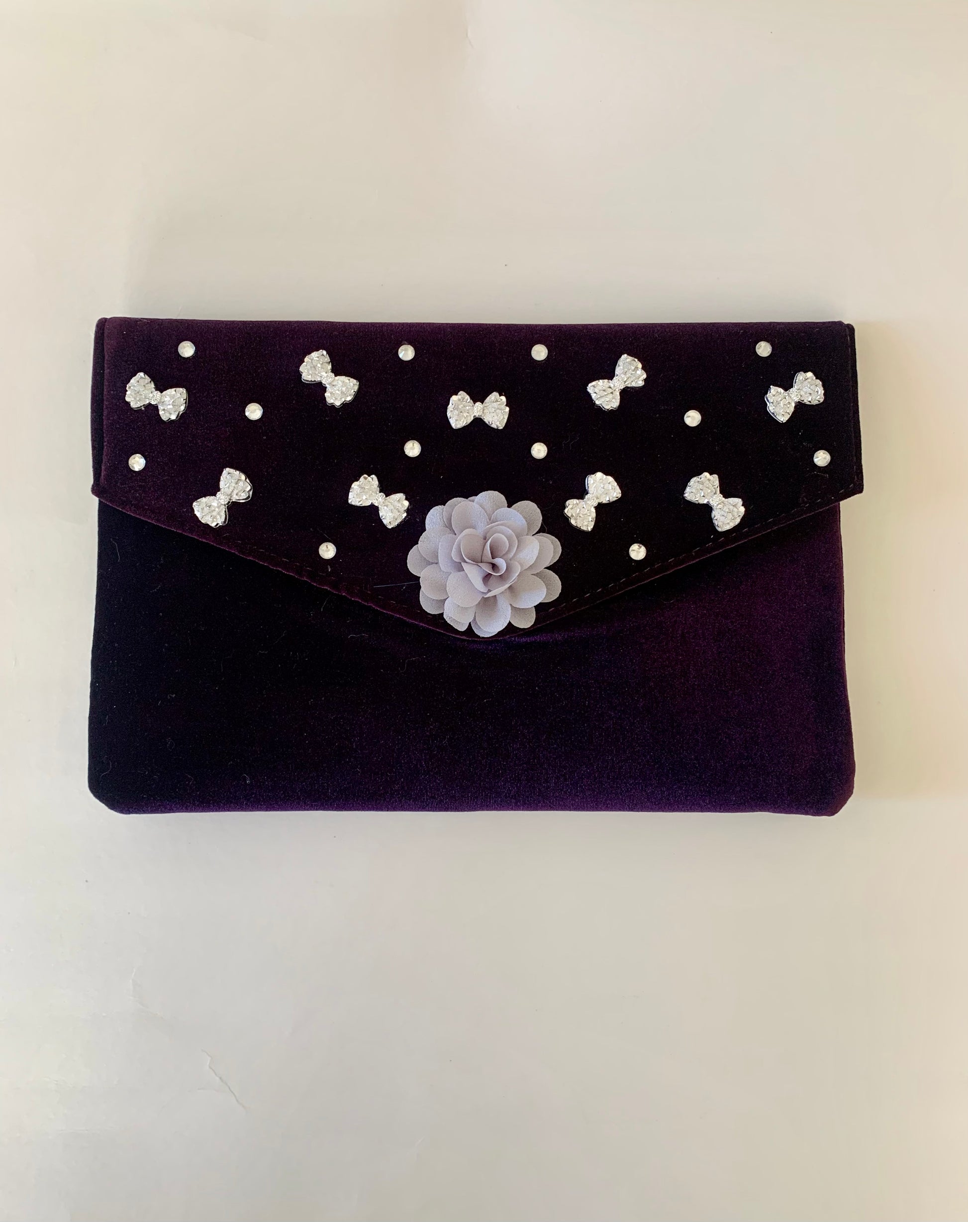 Purple Clutch Bag with Gray Floral and Bow Decorations