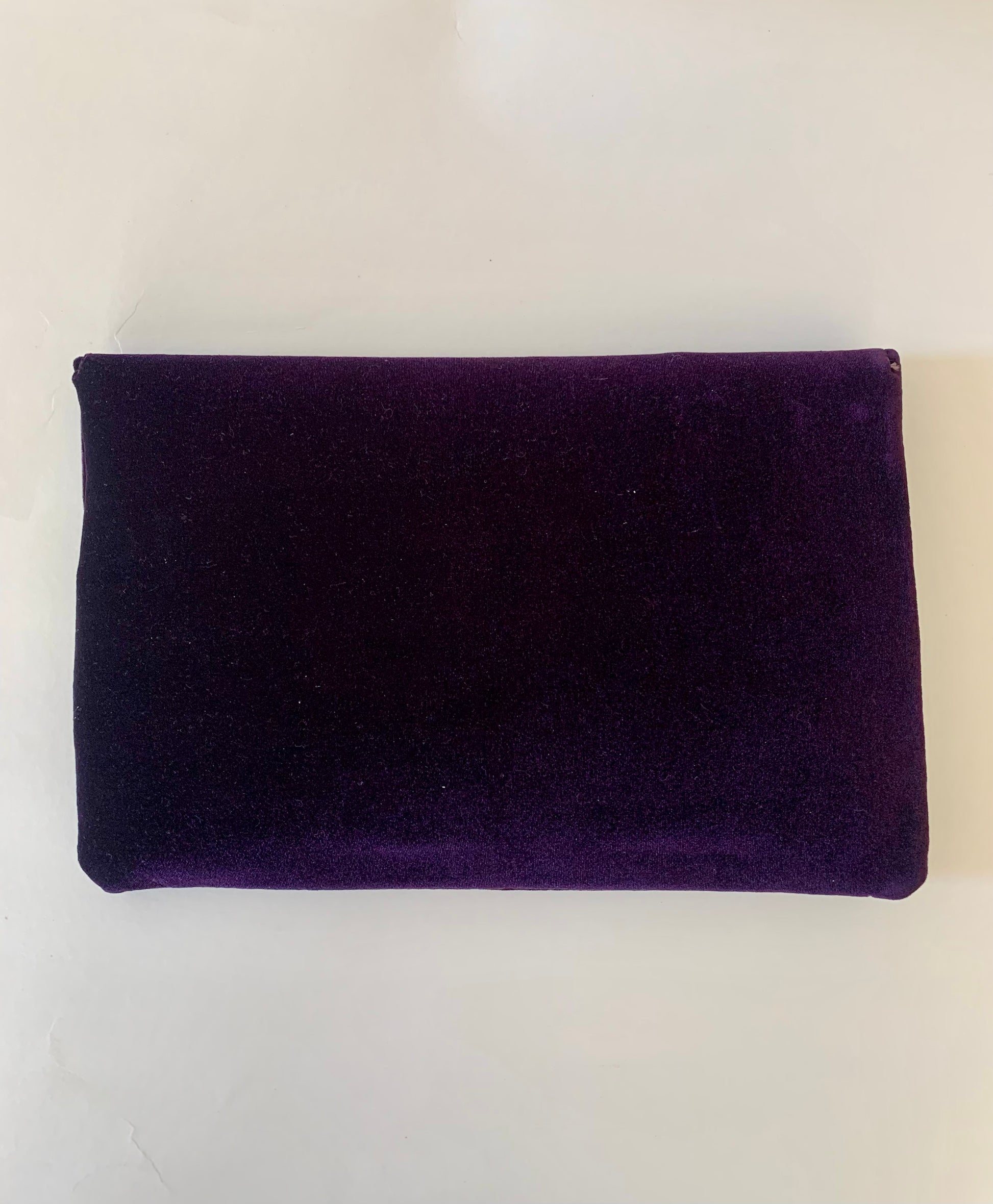 This elegant purple clutch bag, hand-decorated in the USA, features intricate gray floral detailing and a delicate bow accent. Its artisanal craftsmanship ensures a unique accessory that combines sophisticated style with meticulous attention to detail, perfect for elevating any outfit.
