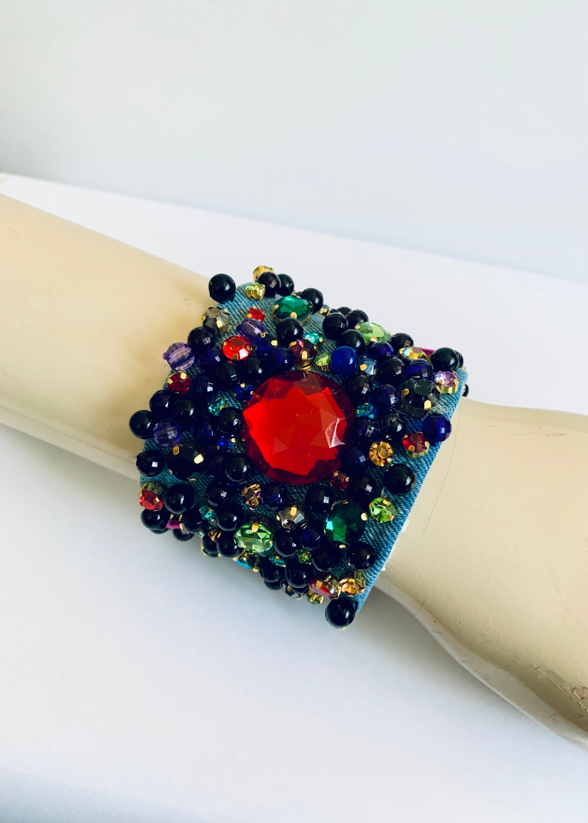 Scarlet Denim Bracelet with Charms and Beads–Boho Chic Jewelry