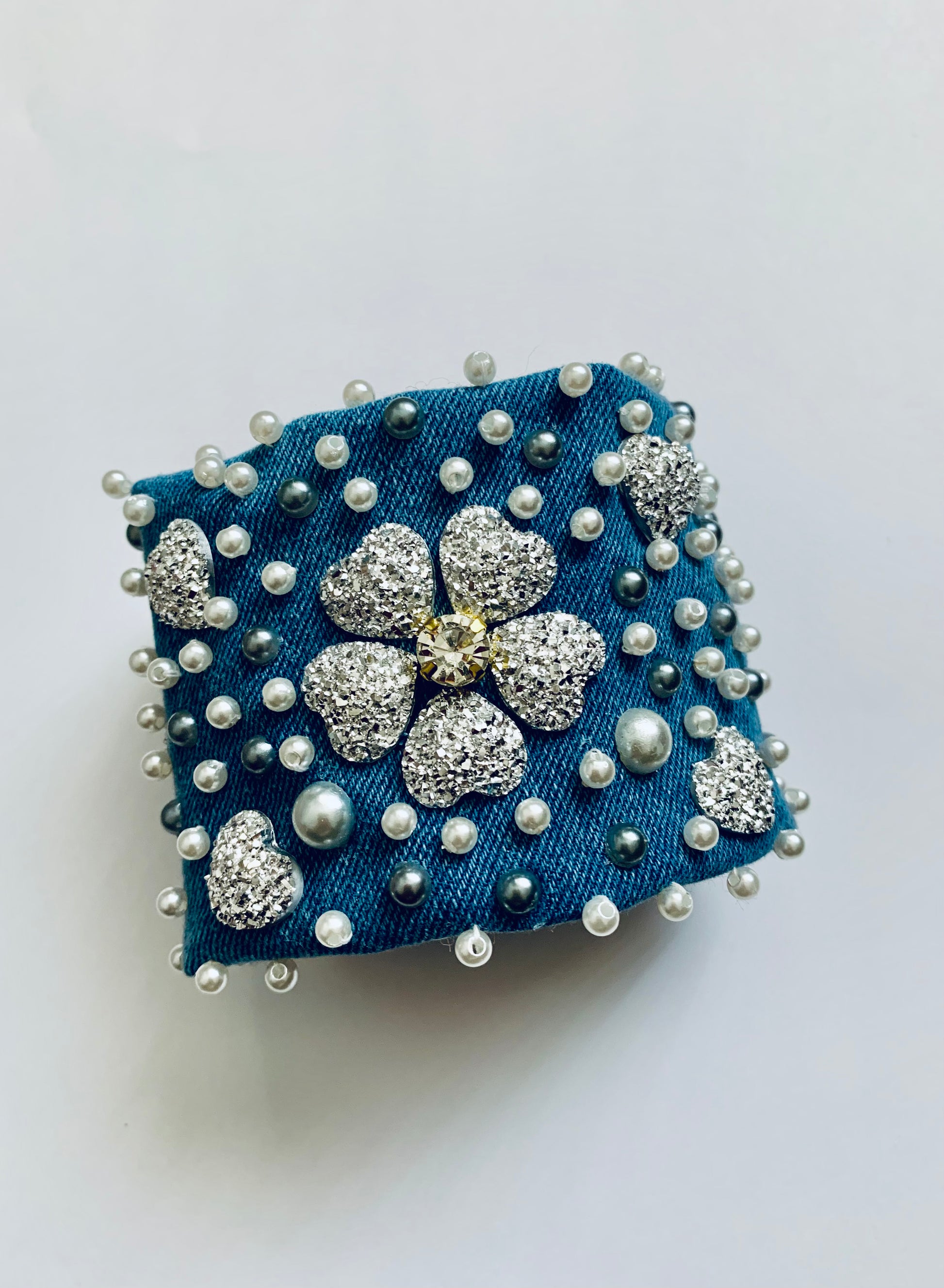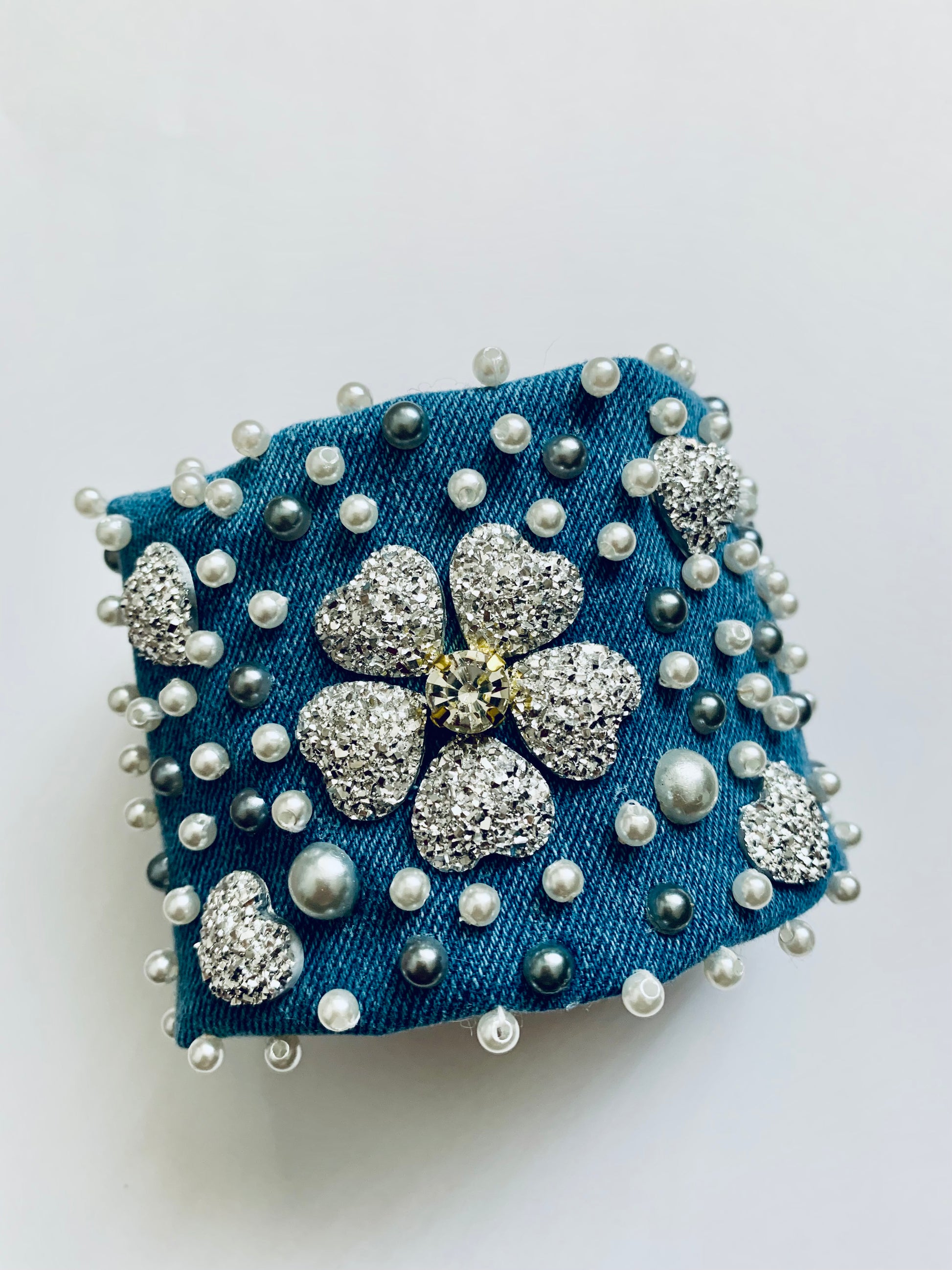 Silver Hearts is a handmade denim bracelet crafted in the USA, designed with shimmering silver heart accents, pearl details and a sparkling floral center that catches the light beautifully. Each bracelet is individually decorated, creating a luxurious and artistic statement piece perfect for customers who love bold, feminine accessories with a modern twist.